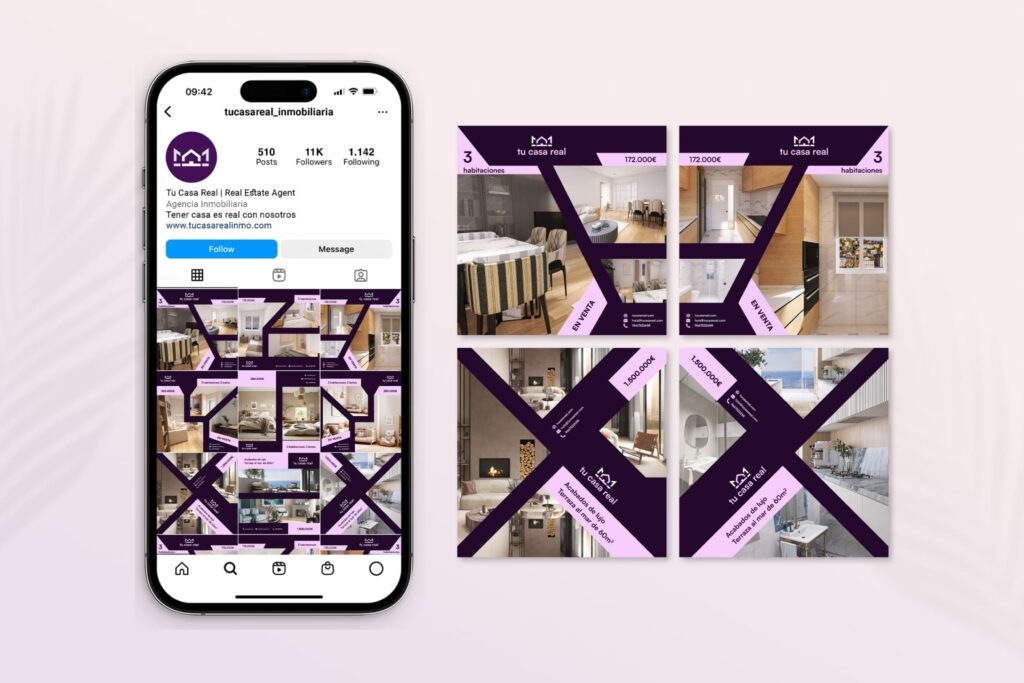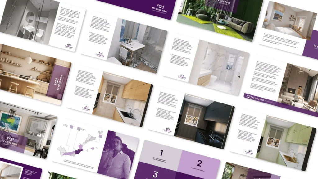 La identidad visual de Tu Casa Real se inspira en la elegancia y la nobleza, características que se reflejan en su paleta de colores. El uso predominante de tonos púrpura simboliza la realeza, la sofisticación y el compromiso de la agencia con la calidad suprema. Estos colores no solo evocan una sensación de exclusividad, sino que también refuerzan la promesa de que cada hogar ofrecido es un tesoro en sí mismo.